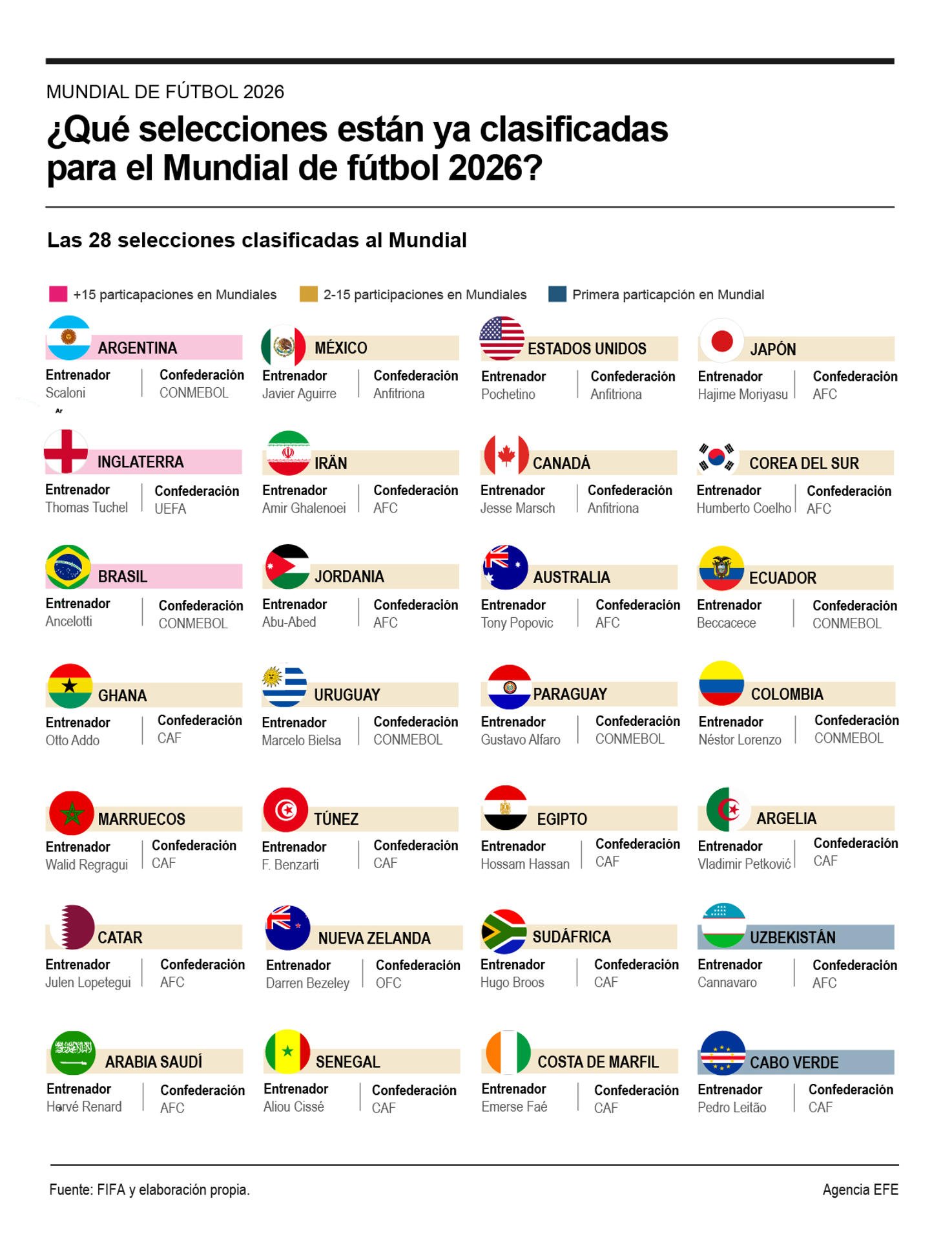A falta de varios meses para el inicio de la Copa Mundial de la FIFA 2026, que se celebrará en Estados Unidos, México y Canadá, ya son numerosas las selecciones que han asegurado su boleto para la cita más importante del fútbol internacional. Las tres naciones anfitrionas cuentan con clasificación automática, mientras que las distintas confederaciones han ido definiendo sus representantes conforme avanzan las eliminatorias.